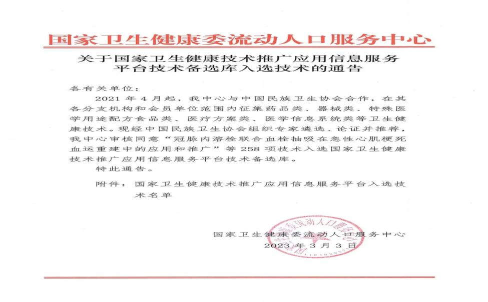 2023年3月3日,國(guó)家衛(wèi)生健康委流動(dòng)人口服務(wù)中心正式發(fā)文,成都思瑞迪“檢測(cè)精子唾液酸酶1/3的方法”入選國(guó)家衛(wèi)生健康技術(shù)推廣應(yīng)用信息服務(wù)平臺(tái)技術(shù)備選庫(kù)。